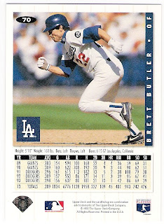 in 1993, the dodgers recognized three different players. they started the season with a '52' patch in honor of tim crews, the former dodger pitcher who died during spring training with the indians. brett butler's 1994 upper deck collector's choice card shows that patch nicely, front
