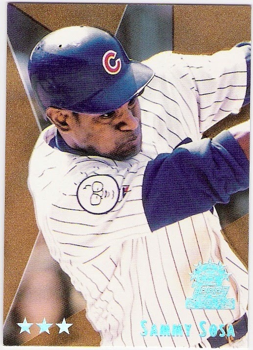 many of you know that one of my mini collections is cards that feature memorial armbands or patches. as an aside, even though the 1999 fleer tradition rod beck card represents the harry caray memorial in my binder, i could not pass up these three sammy sosa cards from 1999 topps stars when i found them in the bargain bin at the lcs a couple of months ago. here's harry, comin' at you!