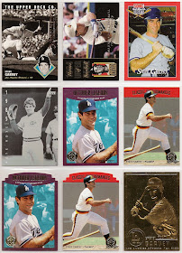 and so begins the glut of parallels. it was great to have a couple of parallels to find back in the late 1990's, but it is quite tedious today. i see that i have a card out of sequence on this sheet, but i'll fix that later. lots of good stuff on this sheet, but the highlight may well be the pete rose card from the 1994 upper deck the american epic set (a companion set to ken burns' baseball documentary) that features garvey lurking in the background as rose celebrates hit number 4192.